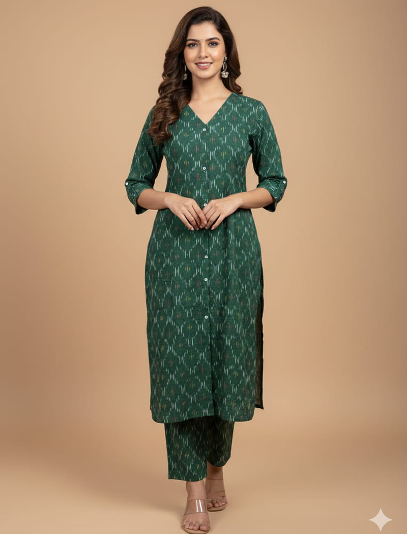 A Line Kurti with side packet trendy neck designs and straight cut pant